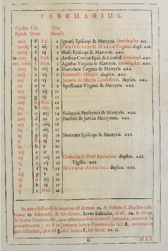 Darin wird wiedergegeben: „In anno Bissextili Februarius est dierum 29. & Festum S. Mathiae celebratur 25. Februarij, & bis dicitur, Sexto Kalendas, id est, 24. & die 25. ...“ Zu deutsch: „Im Schaltjahr hat der Februar 29 Tage und das Fest des Hl. Mathias wird am 25. Februar gefeiert [anstatt am 24., Erg.d.Verf.], und es wird zweimal ‚am sechsten Tag vor der Kalendae‘ gesagt, also am 24. und am 25. Februar.“ (Übersetzung durch den Verfasser)